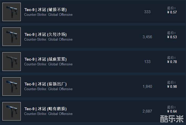 看图可知,冰冠的价格可是太便宜了。崭新出厂也不过1块钱,那么肯定是选崭新出厂咯。另外冰冠是款玄学皮肤,不同皮肤外观的蓝白占比是不同的,喜欢全蓝、全白或蓝白相间的玩家自己选哦。