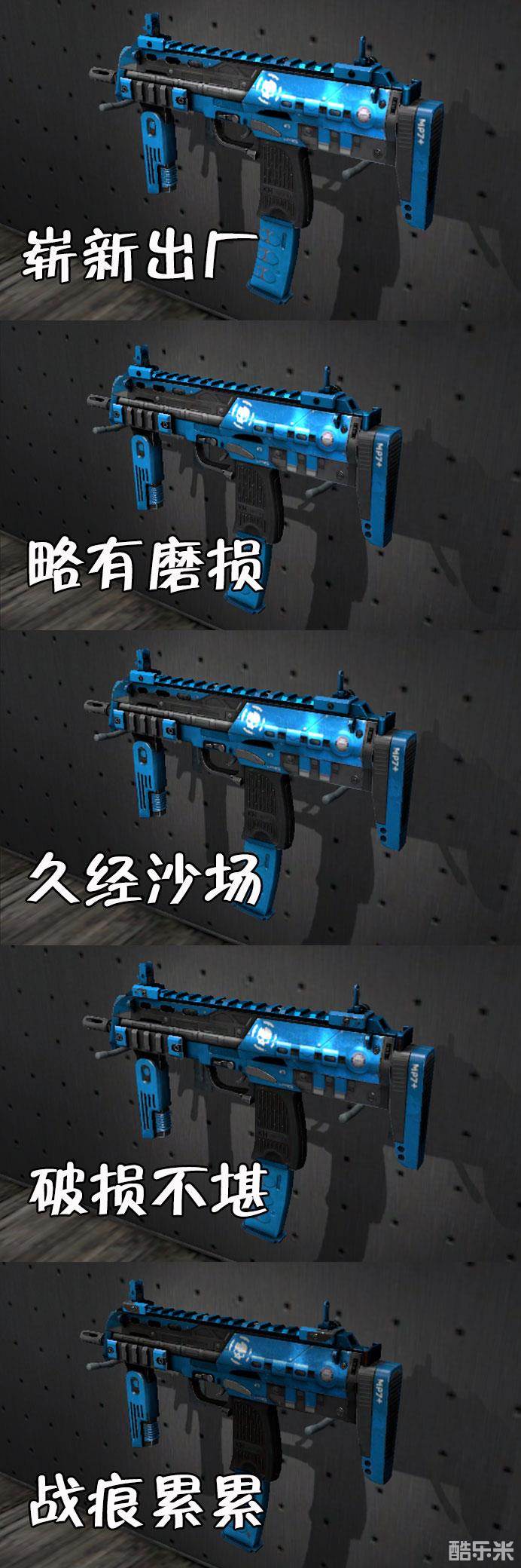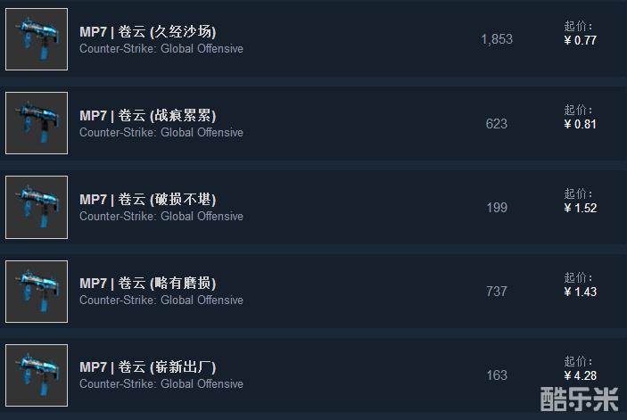 在UMP45遭削弱后MP7出厂率明显提高。卷云不吃磨损,价格便宜是许多玩家的选择。久经才几毛钱,崭新也不过5块钱。所以对于不吃磨损的皮肤来说,随便选。
