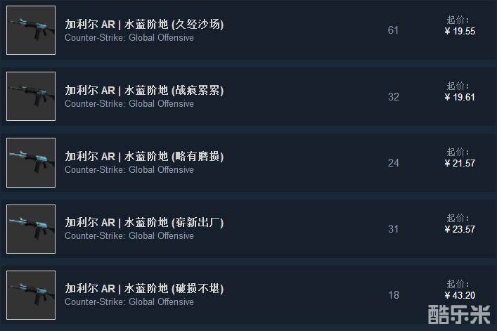 水蓝阶地的价格区别不大,图中破损不堪的那个不用在意,数量少价格挂的高也没用。崭新不过24元,只比久经和战痕贵4块,所以只买崭新就好。
