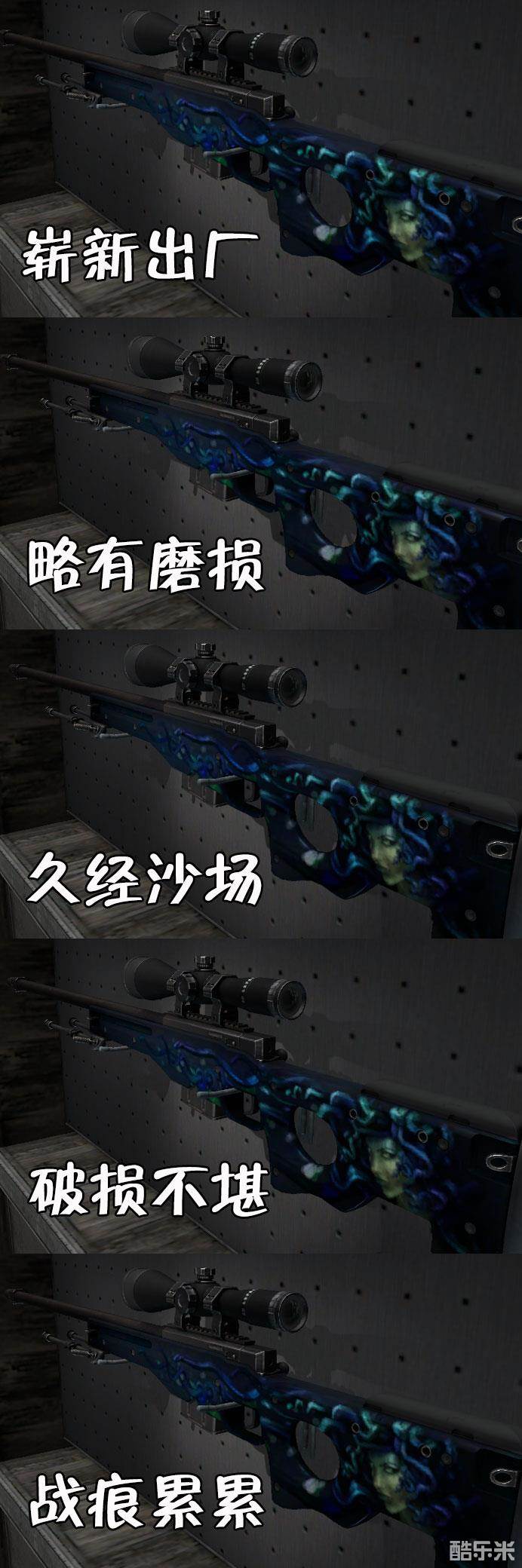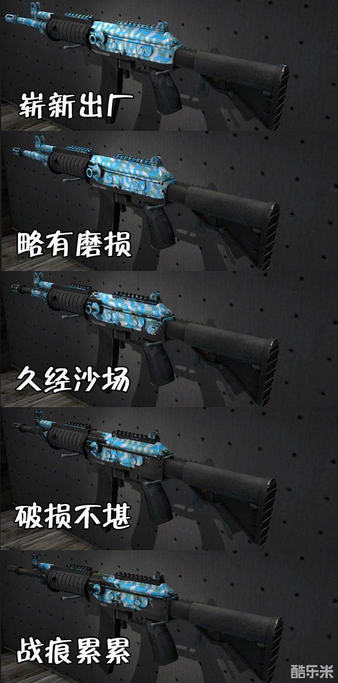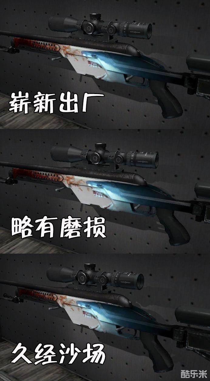 冰冠是卡磨损皮肤,磨损区间为0.00<<0.50。冰冠很是吃磨损,即使崭新出厂也会看到明显的磨损,主要磨损点在枪身凸起处。从外观来看,推荐崭新,而且磨损越低越好。