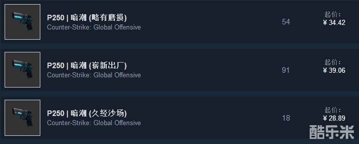 暗潮尽管是冷门皮肤,P250也遭修改,但价格也不算便宜。久经由于外观太差所以便宜,而略磨和崭新价格相差几块钱。暗潮有金属光泽,所以用这款皮肤多数会开高画质(职业哥和重竞技玩家除外,1080Ti也一样全低画质),高画质会将小磨损放大,所以还是推荐崭新。