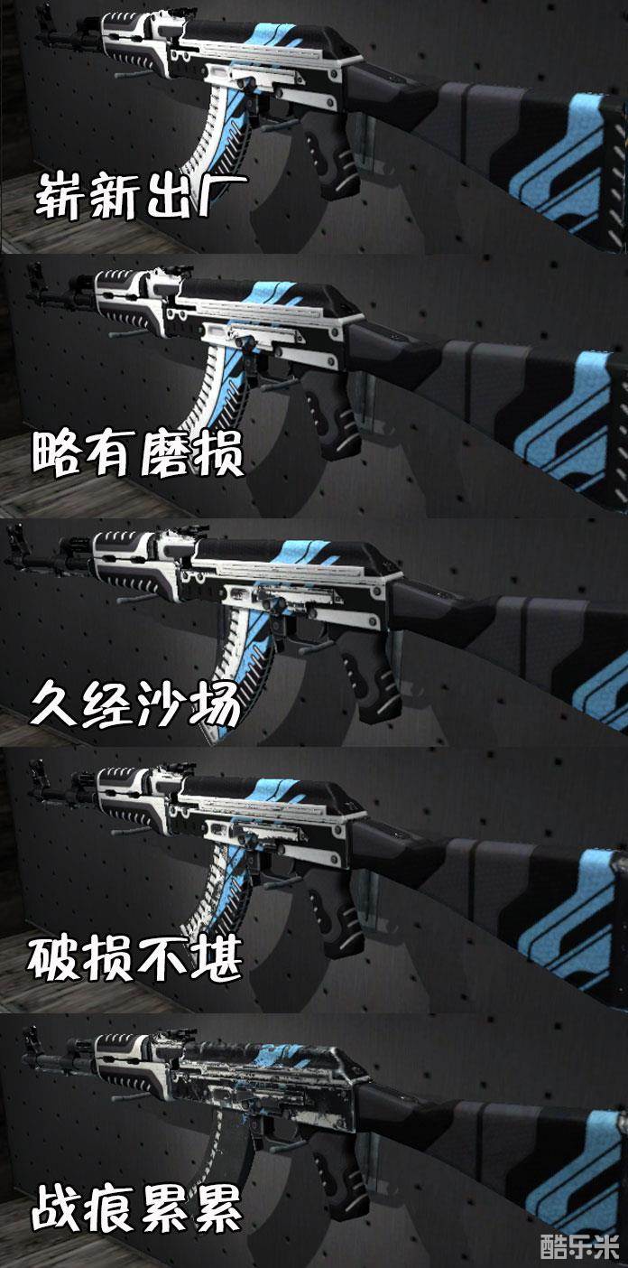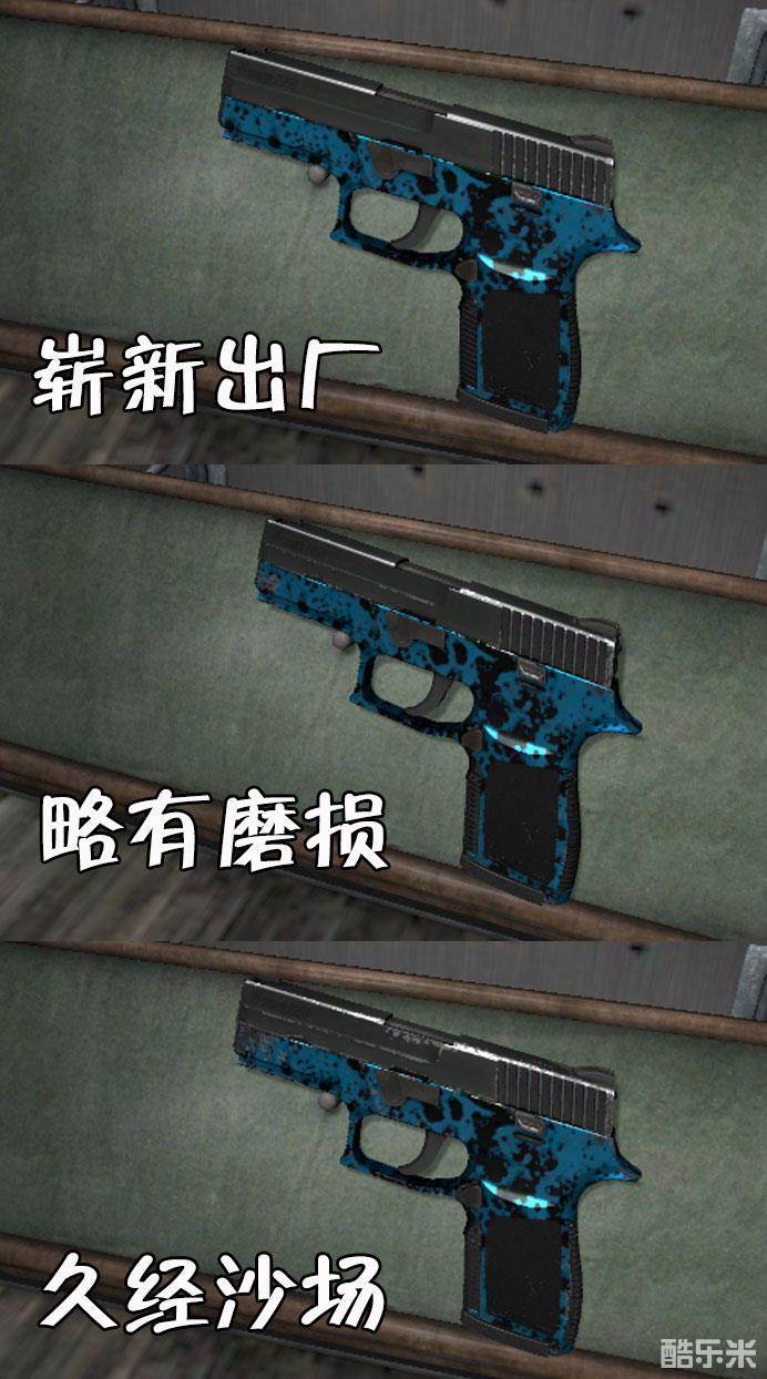 水蓝阶地是款卡磨损皮肤,磨损区间为0.00<<0.70。水蓝阶地极为吃磨损,即使崭新出厂依然会看到明显磨损。所以从外观来看,只推荐崭新出厂,磨损越低越好。