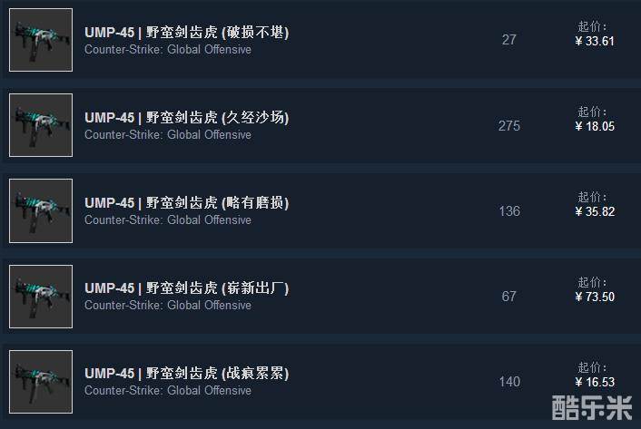 作为UMP-45中最受欢迎的两把皮肤之一(另一款是炽烈之炎),野蛮剑齿虎无论画风还是设计都广受好评。尽管热门,但得益于不吃磨损的特点,花30多块可以轻松选一款好外观的略有磨损, 简直超值。