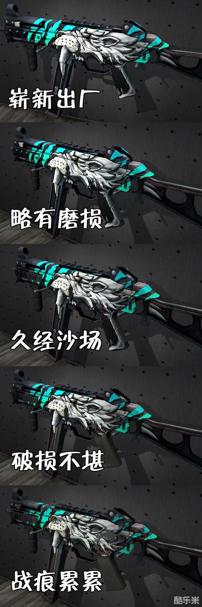 野蛮剑齿虎同样是一款卡磨损的皮肤,磨损区间为0.00<<0.77。值得高兴的是这款皮肤不太吃磨损,从久经沙场到崭新出厂除了亮度有区别,几乎无磨损。野蛮剑齿虎的磨损点在弹夹和扳机握把,破损不堪和战痕累累的这两处图案都是不全的。