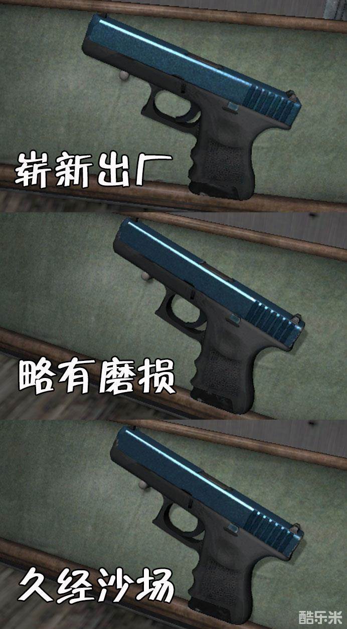 钴蓝禁锢是款卡磨损皮肤,磨损区间为0.00<<0.20。钴蓝禁锢极为吃磨损,优先磨损位主要在枪套筒后端防滑处。从外观来看,只推荐崭新,磨损值越低越好。