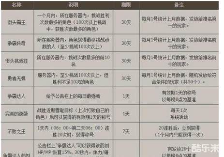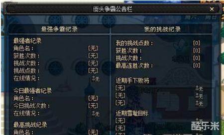 玩家还可以在各地区设置的公告栏上查看挑战战绩等(赫顿玛尔/艾尔文防线现有公告栏西海岸、天界)。每个月1号挑战者纪录初始化,同时,根据玩家挑战/胜利次数发放荣誉称号。