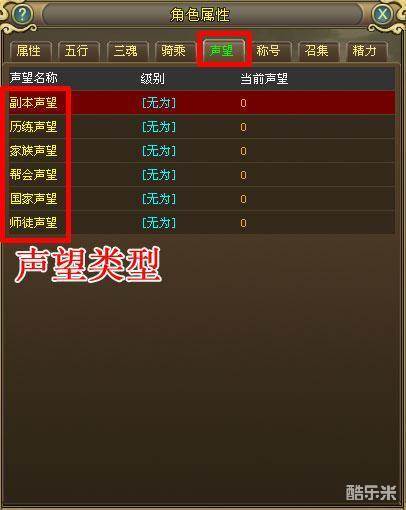 打开人物属性界面,点击界面下方的声望按钮可查看自己的声望。声望的类型有:副本声望、历练声望、师徒声望、家族声望、帮会声望、国家声望。
