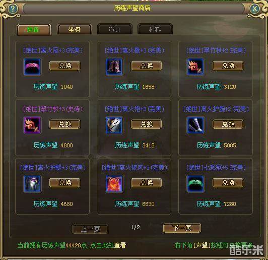 声望系统是玩家获得极品道具的一个有效途径。玩家通过完成任务、参加活动,打副本怪等可以获得声望。只要有足够的声望就可以到NPC孟轲处兑换道具。比如可以兑换7属性的极品装备。