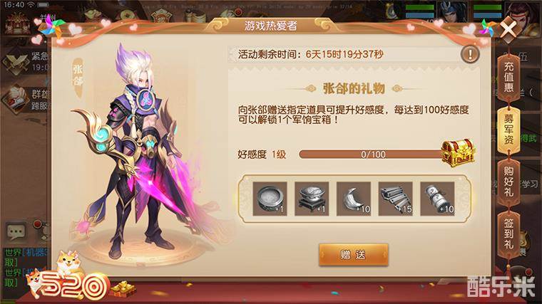 兵家之道,就在于能料敌机先,提前做好战斗准备。在活动界面,玩家可以向天将张郃资助染色道具、宝石、低级兽诀、军资等一系列的道具,提升张郃与自己的好感度。也许有朝一日,张郃将降临于三国世界中,为自己的伯乐鞍前马后呢?