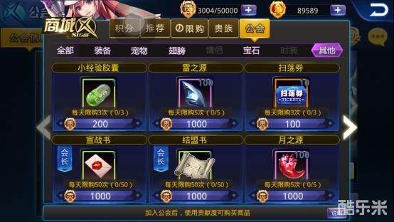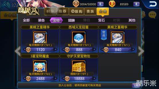 公会贡献近期在公会里面更新出了公会商城,在公会商城里,有装备、宠物、翅膀、宝石等。对于前期的玩家来说紧缺的应该属材料,而在公会商城可以花1000贡献度购买50装备碎片,每天可以购买五次。宠物是针对新手和老手都比较重要的东西,公会商城可以购买黑桃之皇和西域火龙的精华,黑桃之皇根据职位可以购买两次,西域火龙仅仅可以每天购买一次。