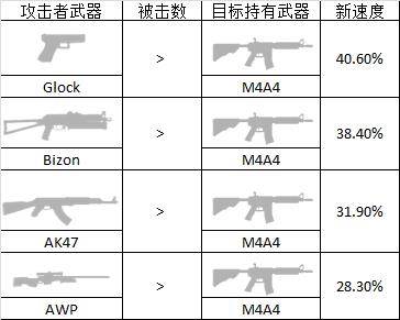 下面这些例子说明了目标在被不同武器击中后的移动速度。如果一个玩家在跑动的时候是100%状态,然后被射中,我们会显示他的新(临时)的速度,这个数字是他们当前持有武器的 ‘移动速度’的百分比。