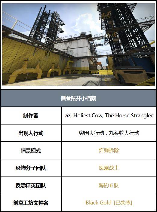 “黑金钻井的背景设定在一座离岸的钻井设备顶部,共有三条进攻路线,是一张节奏紧凑激烈的拆弹地图。”