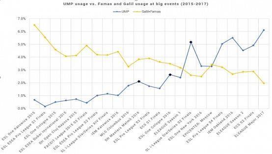 在2016年的余下时间中,车王的击杀比例一直保持在5%左右。直到最近的ELEAGUE Major当中达到了6.1%。与之相比,Famas和Galil合计仅有2%,基本已被抛弃。