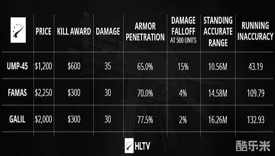 另外除了ESL One New York站之外,车王在CT方的击杀数都大于T方,因此可见这把枪在防守时更容易取得击杀,因为作为防守方你可以主动选择开战的地点来发挥车王的性能。不过即使如此,T方也同样喜爱冲锋枪,UMP也全面超越了Galil作为经济选择。我们将车王与Galil、Famas对比分析一下,看看究竟是什么原因造成UMP对Famas和Galil这两把步枪的超越。