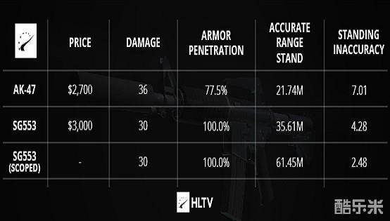 另外,我们对比一下SG553和AK-47。作为唯一一把100%穿甲的武器,SG553能够完全无视护甲,并且在八张比赛地图的任何地方任何角度都能够一枪爆头杀敌,对付有甲目标伤害强于AK。并且如同AUG一样,SG553即使不使用瞄准镜的时候也有更高的精准度,并且在使用瞄准镜的时候有更加迅速的弹道恢复能力。