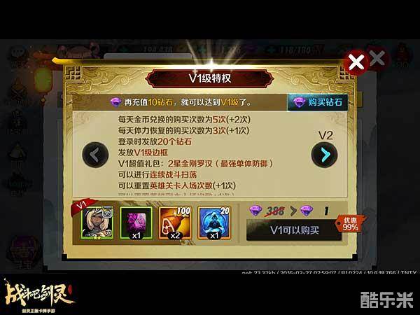 VIP1的特权只需要花费10钻石,就可以获得金币兑换次数+2次、体力购买+1次,登录发放20钻石、连续扫荡、重置英雄关卡次数+1次、英雄副本入场次数+1、天下争霸入场次数+1、武功点数补充机会+1、转盘副本入场次数+1、攻城战入侵次数和收获次数+1、风云棋盘骰子点数+100点等十余项特权。还可以花费1钻石就购买价值398钻石的礼包,内含2星力士、四角宝石、200体力和20点武功点数。绝对的超值,平民娱乐玩家的不二之选!