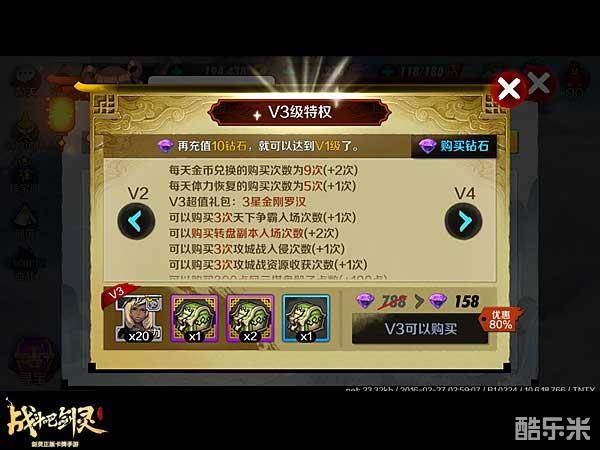 VIP3特权的超值礼包是158钻石购买的三星金刚罗汉以及多个锻造材料、强化材料。拥有给力前排后,可以提高阵容的抗打能力,给后排强力攻击卡牌提供一个优秀的输出环境!VIP3之后战力提升一个阶段,是实用主义小资玩家的上上之选。