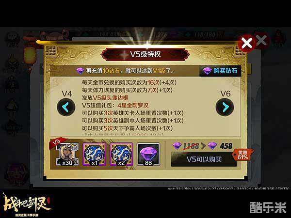 VIP5特权礼包是458钻石直接将金刚罗汉提升为四星,蓝色卡牌前期直接就是一个很大的威慑力。礼包内还含有25级物理武器和饰品的锻造箱和88钻石的直接返还。而且VIP5还将获得头像边框,拥有VIP用户的尊贵身份显示。