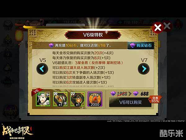 VIP6的特权礼包是688钻石获得三星S资质的反伤拳师金燕以及金燕的重要装备、2000点卡牌经验。这将是玩家可以立马获得的首个S级给力高级卡牌,这张卡牌的获得,将瞬间拉高整个阵容的逼格,前排更加稳固!