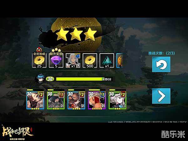 第二天VIP2玩家可以升级到30多级,高V玩家等级更高。在这期间内,会陆续的开放转盘副本、武神之路的玩法。转盘副本中完成一次即可,领取日常任务奖励。武神之路则按照能打过对手的最低阵容排兵布阵,并尽可能每次阵容中有召唤师来恢复血量。增益的种类不满意的,可以花费一定金币随机换一种,选择合适的增益,可以让连胜之路走得更远。通关武神之路,可以获得一个S资质刺客离的碎片。