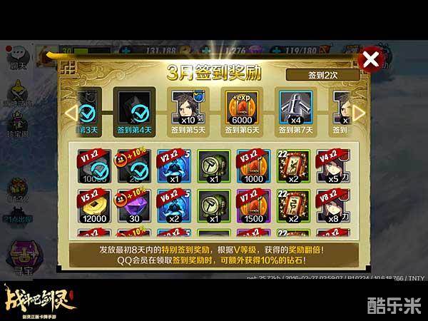 签到中,也有不少天数内,奖励是钻石的。V等级可以获得部分签到的翻倍奖励,QQ会员在领取签到奖励时,钻石也有10%的加成。