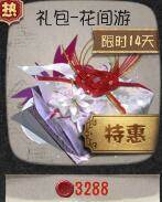 目前游戏中礼包花间游的售价为3288回声,折合人民币大约是329元左右,礼包花间游包含红蝶,红蝶花嫁皮肤和红蝶挂件蝶影发簪。限时14天售卖。在商城中的幻象兑换中的推荐界面即可查看此商品