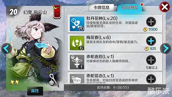 从易云山的技能可以看出,牡丹花种非常实用,可以持续恢复全体队友的血,虽然回复度不高,但是其有附加效果,等于提高了防御力。梅花香也是一个辅助技能,提高全体队友的攻击力。总结五大技能全部都是辅助技能,加上幻鬼易云山[赤蛇堂]是比较容易获得的卡牌,作为辅助的卡牌技能非常实用,推荐使用。