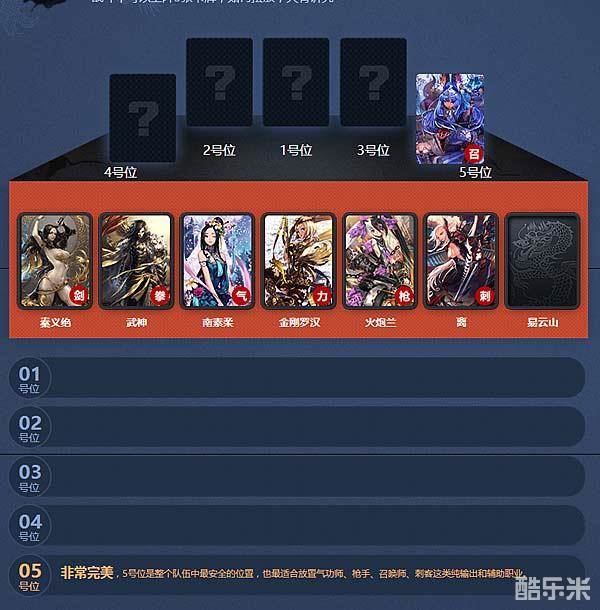 通常阵容分为前排1号2号3号站位,后排4号5号站位。那么结合实战战斗,召唤师职业是游戏中唯一的辅助职业。召唤师的技能以治疗为主,可以为队友恢复生命或者提供用于抵消伤害的护盾。建议放置在队伍后排。