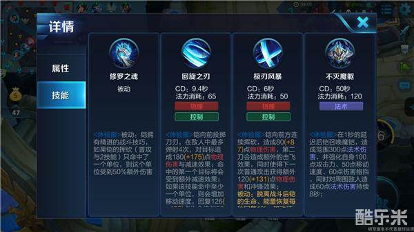 修罗之魂(被动):铠的普攻和二技能对单体伤害有额外的加成,这使得铠前期有不错的单挑能力,如果铠打野的话,对单体野怪也会额外的伤害,所以前期铠的清野速度会很快。