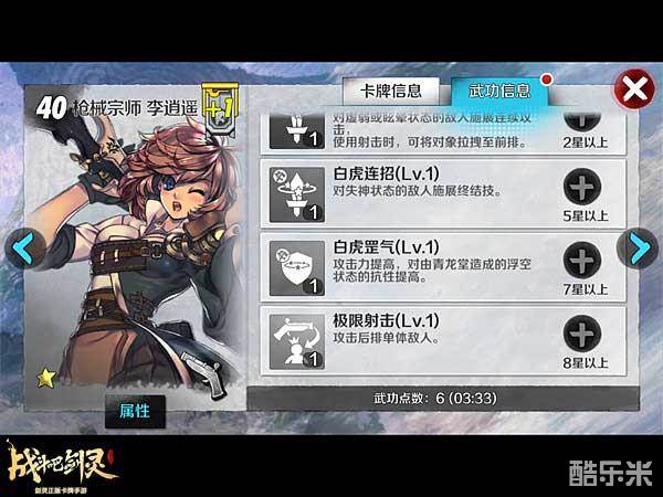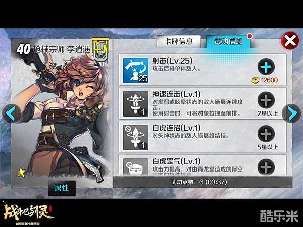在枪手这个职业里,A资质的后期卡牌就是李逍遥和他的徒弟陈苏儿。陈苏儿的武功是沉默后排单体。两者的武功各有优劣。都是一星的时候,陈苏儿多一个沉默的控制技能,更为厉害;二星之后,李逍遥的技能一旦发挥,效果是更加突出的;五星之后陈苏儿的浮空控制为其再度加分。所以说,有了好的卡牌,尽快的升星培养也是非常关键的。