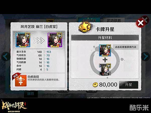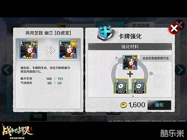 强化的材料都是比较容易获得的。卡牌中的高资质气功师容易获得的不是很多,中期主要培养的就是A资质的华仲和西子捧心南素柔。而S资质的风月艺妓幽兰一旦抽出,就是更加给力的存在,前期四星到五星升星较难,要通过优先强化来提高战力。