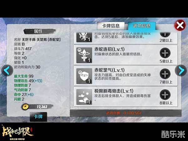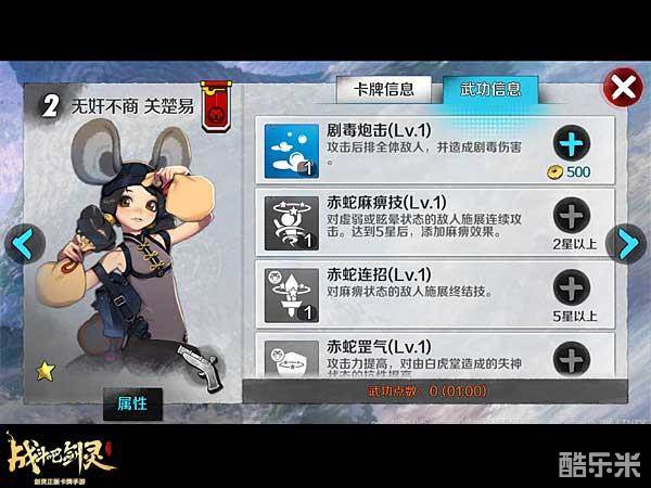 卡牌中,有剧毒伤害的比较少。幽兰的剧毒是单体攻击,而关楚易的后排群攻,伤害更为显著。5星后添加麻痹效果,增加了控制。只是关楚易本身也是后排的脆皮,保护好自己也是非常关键的。