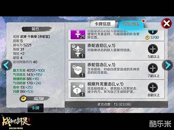 千甄拳的武功还是非常厉害的,前排的沉默,让对方的前排三张卡牌直接都无法打出伤害。这就为队友提供了较多的内力恢复时间和输出时间。能够换位,可以保护前排的残血队友,自己有防护罩,防御能力很强。8星后更是可以在沉默前排的同时减少其内力,直接让对手前排的战斗力削减,不愧是S资质的武神!