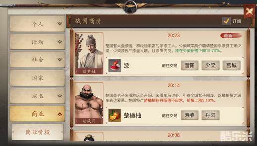商业情报的内容以商品的在特定城池的价格变动为主,比如上图所示的最新情报"楚国有大量漆园,和经验丰富的采漆工人。少梁城宰高价聘请楚国采漆良工来少梁,少梁漆园产漆量大增,且漆质优良。漆在少梁价格下降15%."