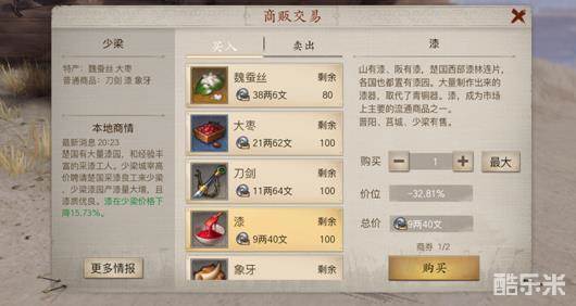 情报下方列出了漆流通的3座城池,在其他的城池是无法买、卖漆的。当看到上面的消息后,则可考虑前往少梁采购漆,而到晋阳或者莒城卖出而赚取差价。当然,市场的信息千变万化,晋阳和莒城的漆并不一定比降价后的少梁漆价格更高。这就需要将军多方查探,确定最优的买卖策略。
