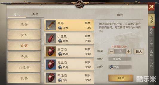 从每日的活动奖励中可获得大量商券,在砸敌国镖车时也能获得非常多的商券噢。此外,也可以在世界商会的日常一栏购买商券,每周有一定的限购额度。