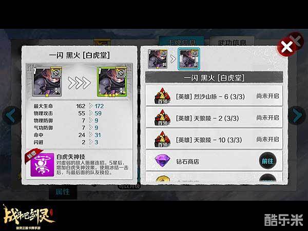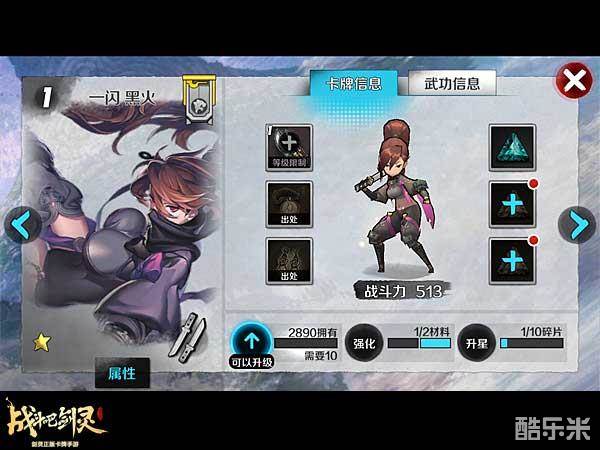刺客的黑火,强化需要用到的材料是红色的外功身法,由于用到这个材料的卡牌较多,黑火作为后期的卡牌,升星途径较多,可以选择强化顶级。