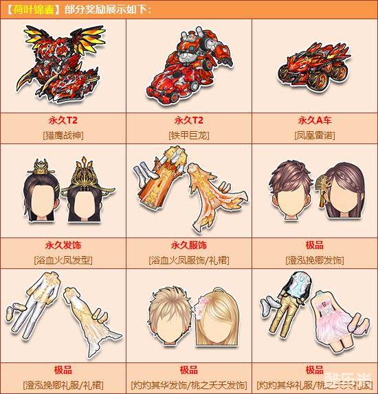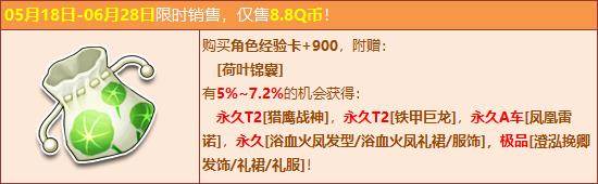 5月18日-6月28日,购买角色经验卡+900,附赠【荷叶锦囊】,有机会得永久T2【猎鹰战神】、永久T2【铁甲巨龙】、永久A车【凤凰雷诺】、永久【浴血火凤发型/浴血火凤礼裙/服饰】、极品【澄泓挽卿发饰/礼裙/礼服】或其他奖励之一!其中极品概率范围为:5%~7.2%,非极品概率范围为:92.8%-95%。