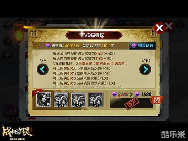 墨灵火秦义绝VIP9获得即为二星,VIP14可直接获得四星,VIP15直接获得五星,并且拥有相对应的各种强化材料、装备和宝石。是高V玩家直接晋升高战力的尊贵身份象征。