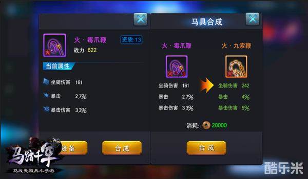 跟随英雄们南征北战的过命之交怎可没有自己的新装备?战马新增装备栏,装备可增加战马属性,共分为:马鞍、马蹄铁、马鞭、马铠、战旗升级可提高马具属性及品质。