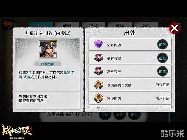 洪连的初始获得是1星状态,这就需要大家多多收集卡牌碎片来进行升星。不过,洪连卡牌碎片并没有英雄副本产出,只能通过钻石商店、稀有寻宝、高级寻宝及攻城商店获得,需要大家慢慢积攒碎片。
