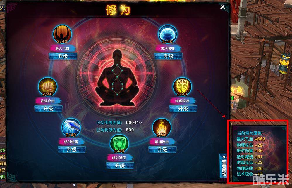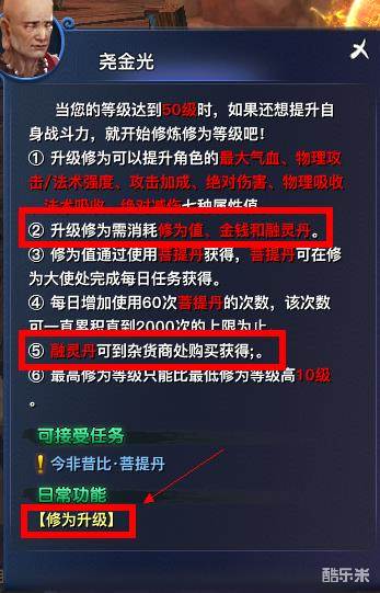 当玩家通过完成以上任务获取了修为以后,玩家可以前往尧金光(五方城68:325)处点击修为升级通过消耗修为、金钱和融灵丹(高等级修为需要百纳丹和千宇丹)来强化自身属性。