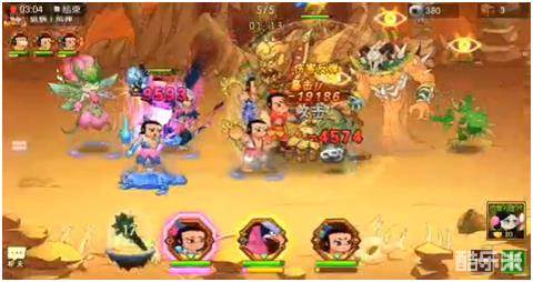 第4小关:本关要需要注意会加血的荒沙怪。大娃等其他娃娃的技能都可以全部用掉,然后放花仙杖释放吸能量,干掉皮厚的蝎子后在放火莲灯!红莺先把技能留住,等看见荒沙怪加血的时候立刻用技能打断。打断沙怪后就可以顺利通过!本关需要注意五娃最好是满能量状态,二娃也有技能最好就是留着。
