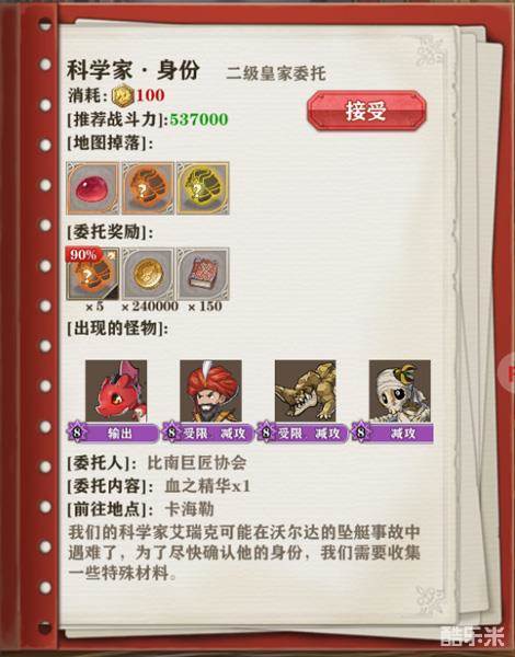 而在皇家冒险委托的接取界面中,会详细显示掉落物、接取战力需求以及怪物技能等冒险委托相关信息,与常规的冒险委托不同,在皇家冒险委托中达到90%的完成度并不能在下一次直接选择派遣,只会获得相应数目的传奇碎片作为奖励。