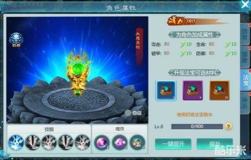 法宝可以增加角色的攻击、生命、破甲和防御;法宝的阶数越高获得的属性也越高;法宝升级主要消耗法宝精华法宝精华主要来源通过日常活动来获得法宝升级不但可以增加大量属性,还能解锁法宝技能。