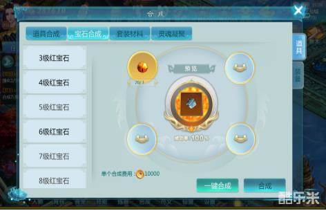 宝石合成需要消耗上一级的宝石以及部分铜钱,合成一个2级宝石则需要3个1级宝石以及10000铜钱的合成费用,依此类推,最终合成一个20级宝石则需要3个19级宝石和190000铜钱的合成费用。