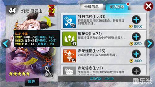 幻鬼-易云山的2技能可以为同队队友提供相当可观的命中+穿刺属性,可以看到,在2技能31级时,已经可以为全队队友提高51点穿刺,相当于3个六角绿柱石。