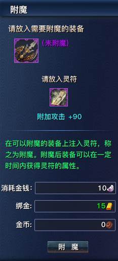 4、点击附魔按键,花费一定量的绑定金,既可完成附魔。