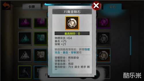 【金刚石】增加物理攻击和暴击、穿刺,属于物理伤害类宝石。最适用于枪手、刺客。