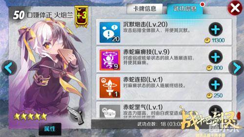枪手火炮兰S级别资质的卡牌,类似于武神都是沉默攻击,但是仅仅需要30内力,只要被沉默敌人后排40内衣的卡牌直接无法释放技能10秒,一般来说放在3号位置尽多的拖延4/5号卡牌的技能释放,给已放增加更多的优势!